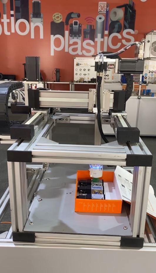 In this application simulation of a customer dealing with pneumatic cylinders, solenoid valves and accessories, a "pick & place" task that was still carried out manually was to be automated. In the end, up to 12 picks/min could be realised. In this size, the gantry has a repeat accuracy of 0.8 mm and can accommodate a payload of up to 2.5 kg. The end effector used is a Cobot pump from Schmalz, which picks up the workpiece by generating a vacuum at up to -600 bar. With a maximum payload of 3 kg, the Cobot pump is ideal for automated small parts handling.